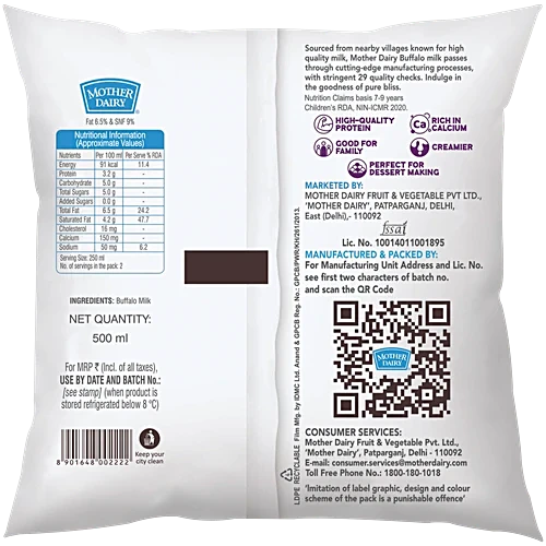 Mother Dairy’s Pure Buffalo Milk is known for its creamy and rich taste. It is packed with higher fat and solid non-fat (SNF) content, making it a nutritious choice. This milk also contains A2 protein, which is believed to have several health benefits. The milk is sourced from carefully selected buffalo farms to ensure quality and freshness. Enjoy the wholesome goodness of Mother Dairy’s Pure Buffalo Milk, perfect for a variety of uses from drinking to cooking and baking.